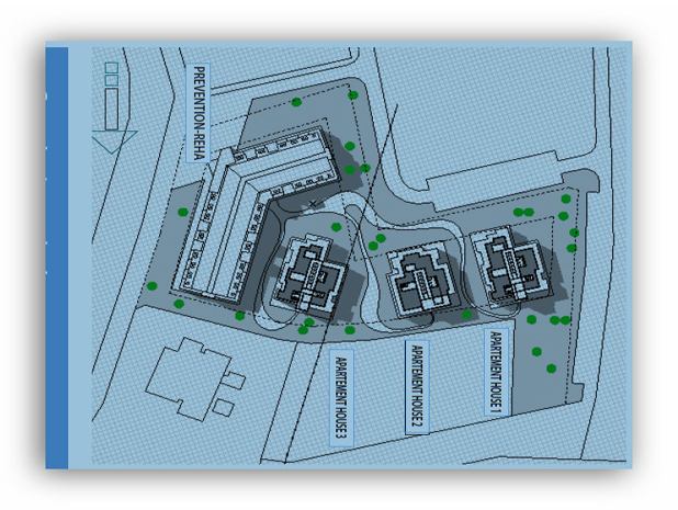 Das vierte Gebäude hat eine langgezogene "L" Form und es enthält Erdgeschoss, ein Stockwerk und Mansarde. Im östlichen Flügel gibt es Wohneinheiten und die Rehabilitationsabteilungen, geplante Hotelzimmer befinden sich im südlichen Flügel. Die durch Aufzüge verbundenen Wohneinheiten und Hotelzimmer haben schattige Terrassen mit Blick auf den Balaton. Ein Restaurant im Erdgeschoss, und ein Café sollen die Bewohner kulinarisch verwöhnen.Die Gebäude werden mit Baumaterialien von hohem Standard, als Niedrigenergiehäuser konzipiert. Die Idee vom "grünen Haus“ entspricht auch die Gestaltung der Gartenanlagen, schöne Flanierwege, Pergolen und der vorgesehenen Parkplätze pro Wohneinheit.